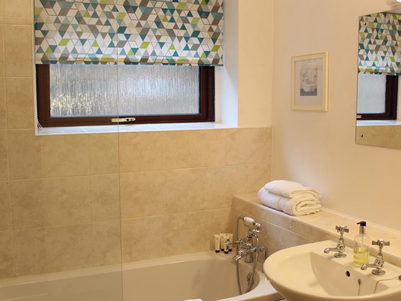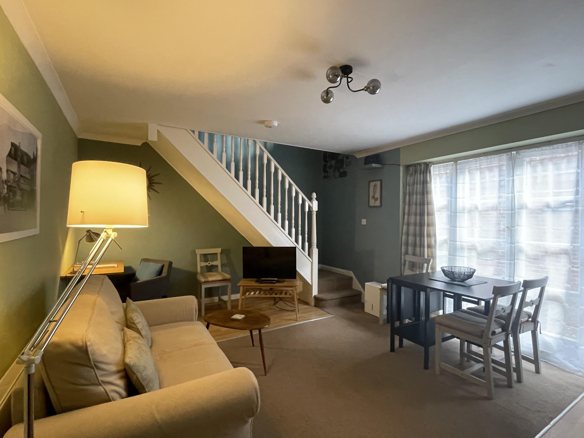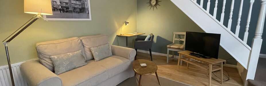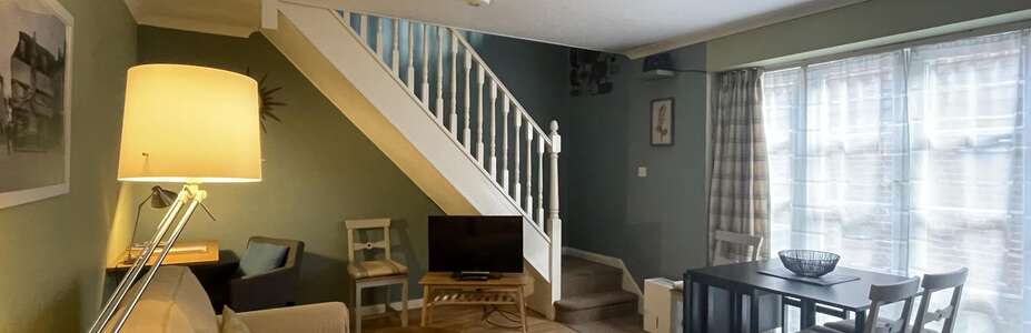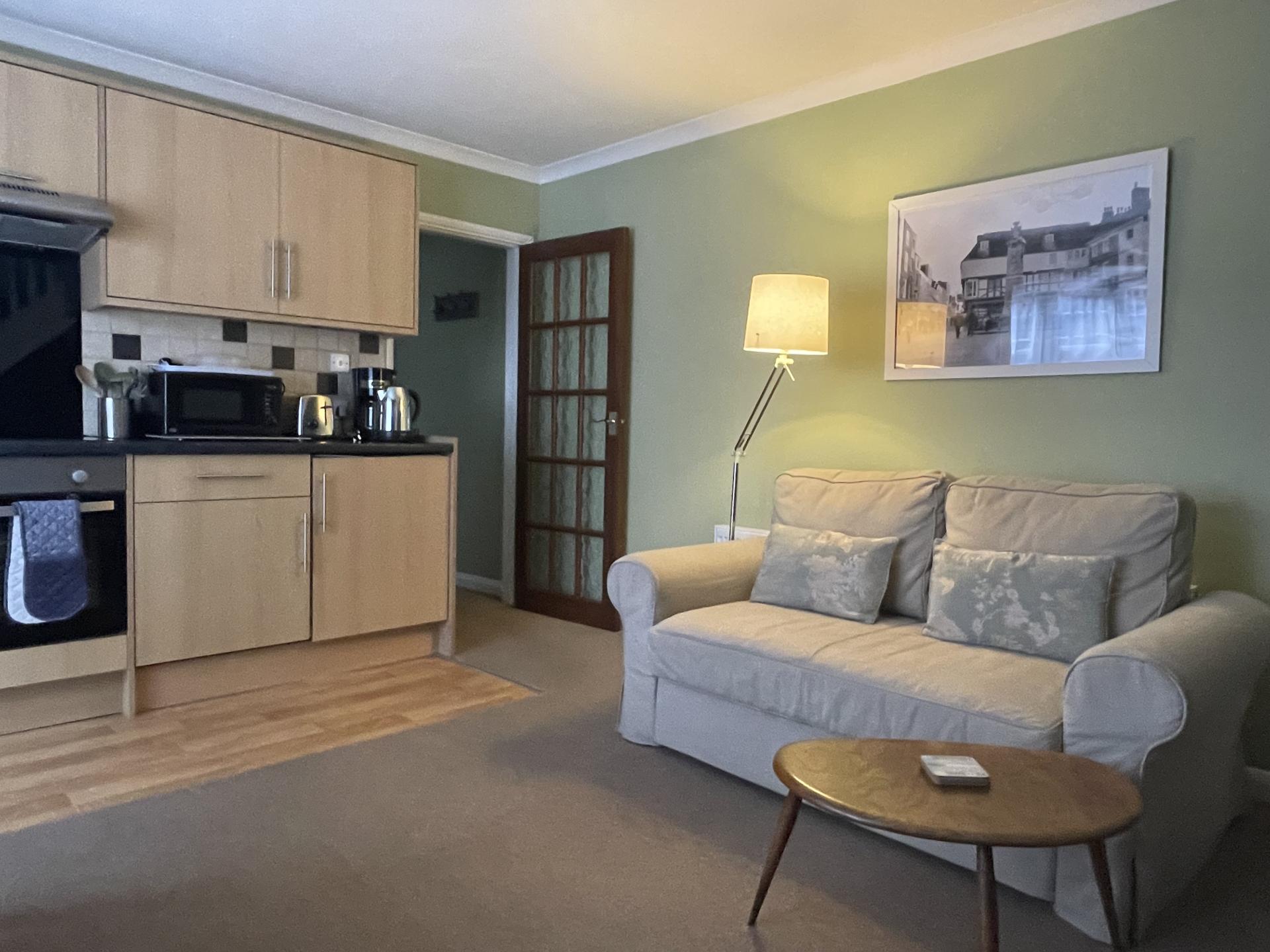 On the ground floor there is a living area with a sofa, fully equipped kitchen area (including dishwasher) and a workspace area. The bathroom, with bath and shower above, is also on the ground floor and there is a small utility area off the bathroom with a washer/dryer.